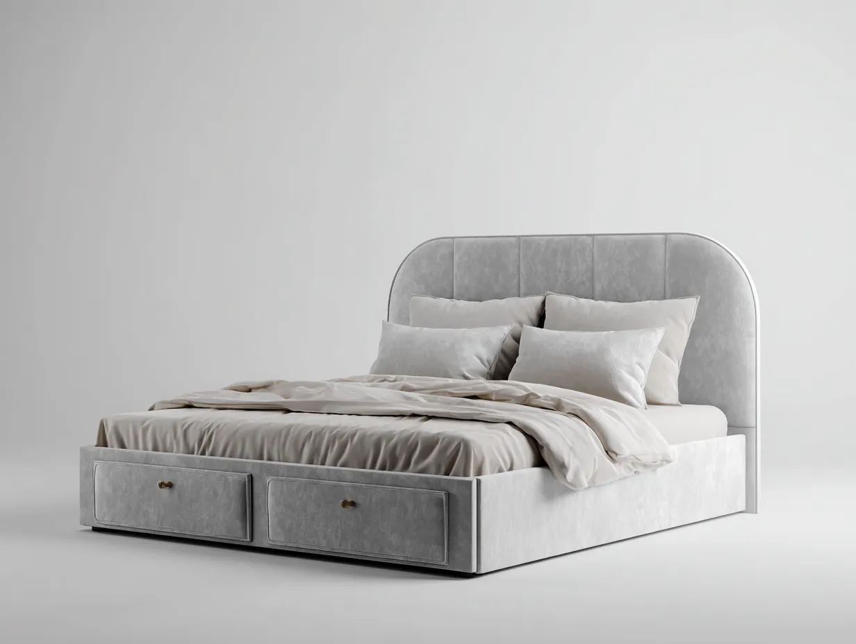 Le lit est équipé de tiroirs intégrés à la base, offrant un espace de rangement pratique sans modifier l'esthétique générale. La tête de lit rembourrée assure un appui confortable pour les moments de détente.