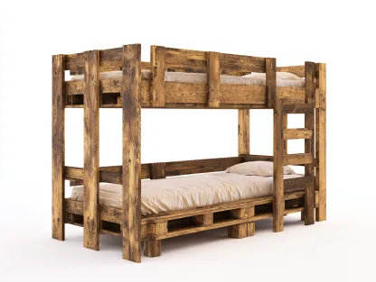 Ces lits superposés en bois massif offrent une solution fonctionnelle et esthétique pour l'aménagement de la chambre. Leur structure robuste et leur design d'inspiration rustique apportent un caractère authentique tout en optimisant l'espace disponible.
