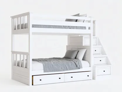 Le lit supérieur est accessible par un escalier intégré, conçu pour une montée sécurisée. Des espaces de rangement sont intégrés à la structure, permettant d'organiser facilement les affaires de chambre sans ajouter de mobilier supplémentaire.